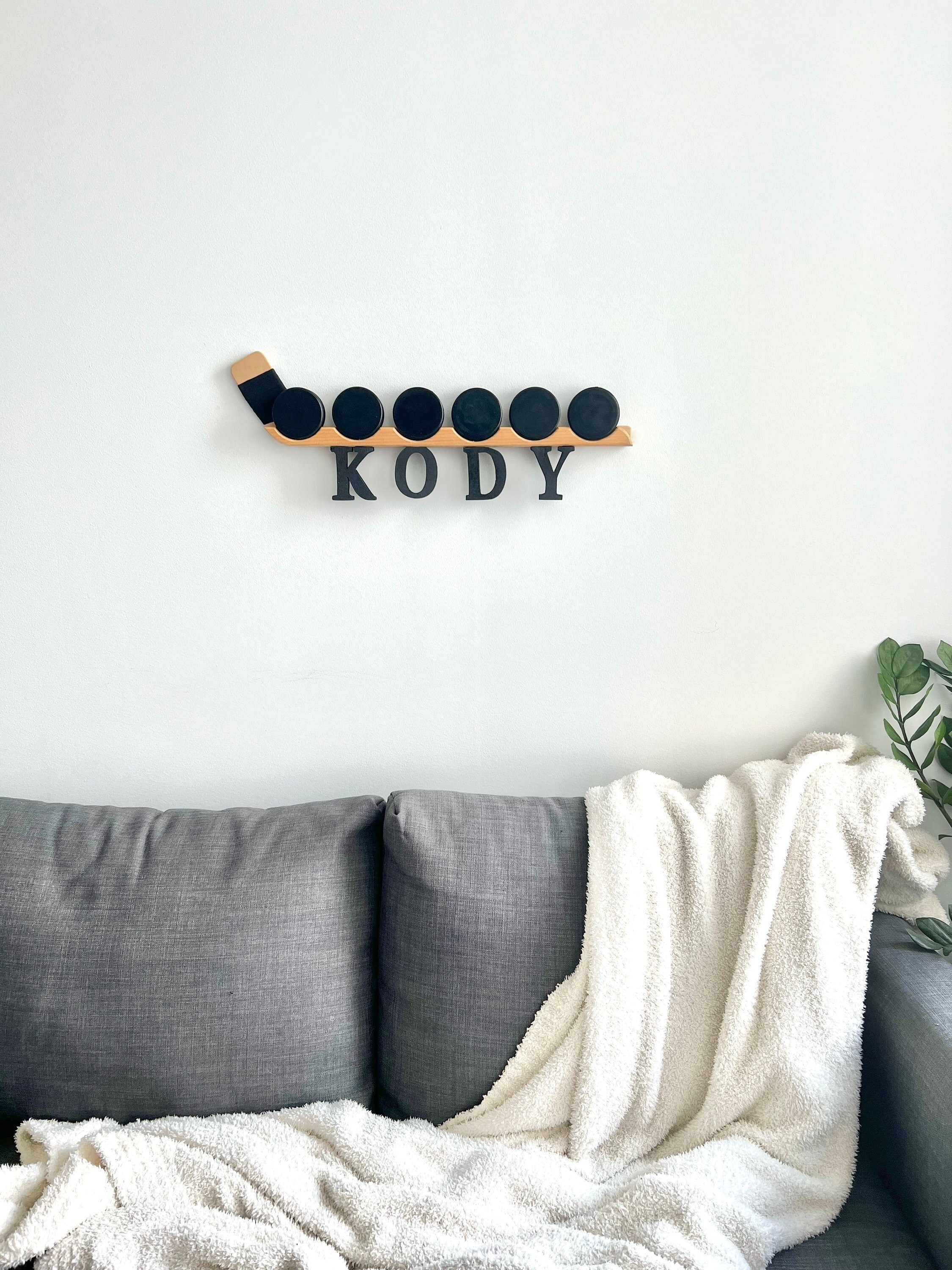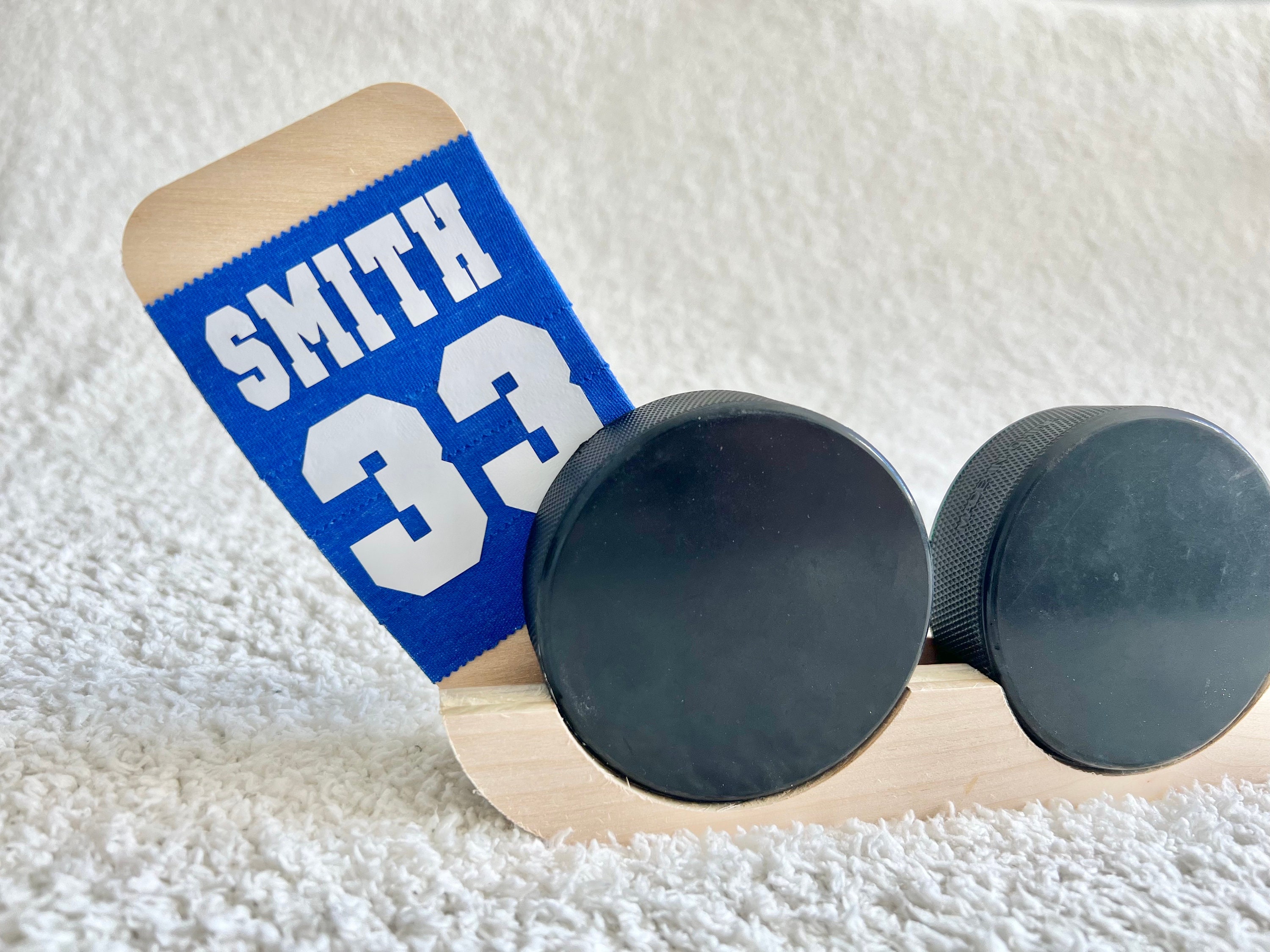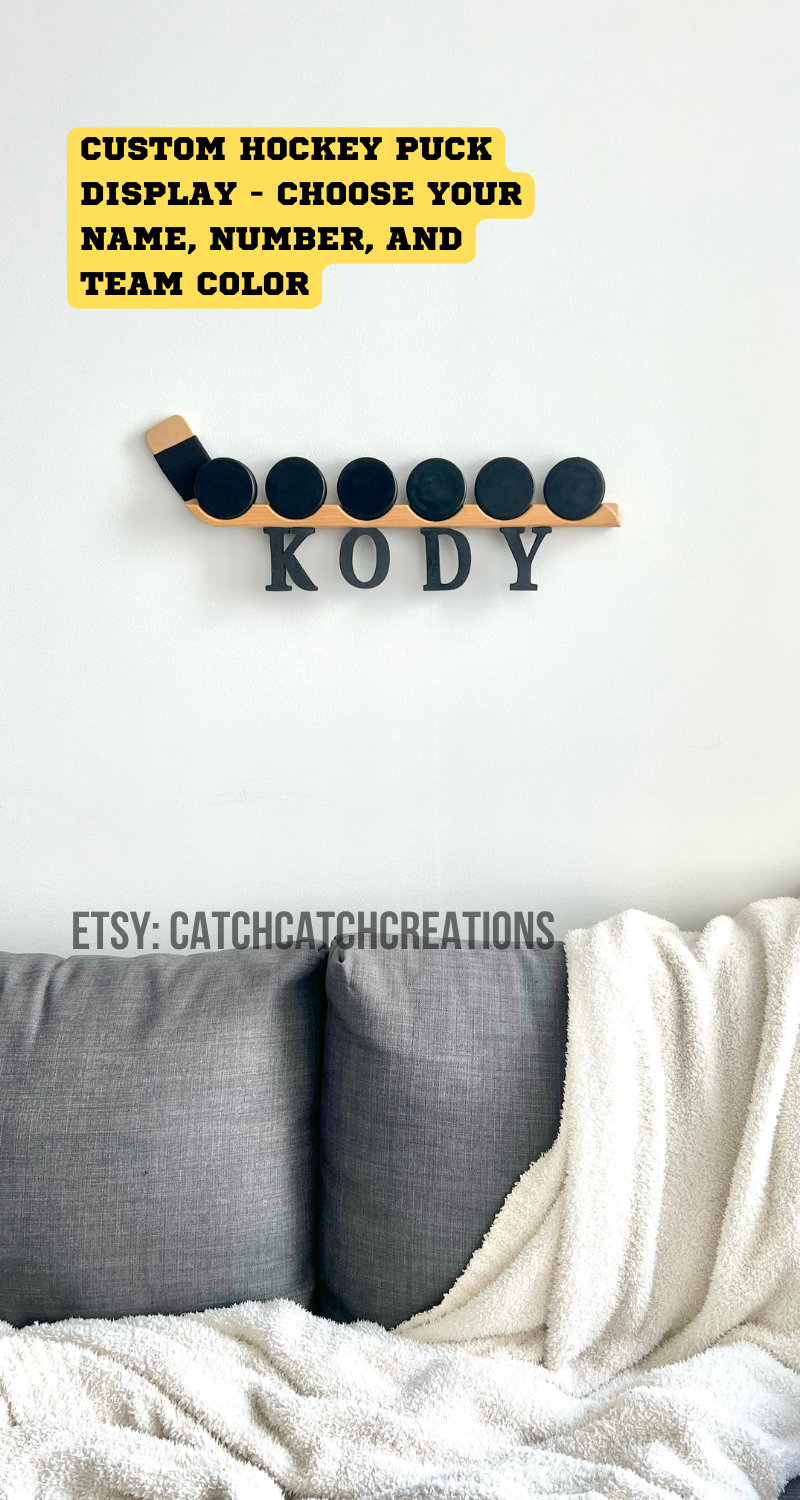 Hockey puck display - can be customized on the tape with name and number or personalized with wooden letters (max 6 letters)! Made of wood and can hold up to 6 pucks. Nail holes are predrilled in the product for wall hanging.