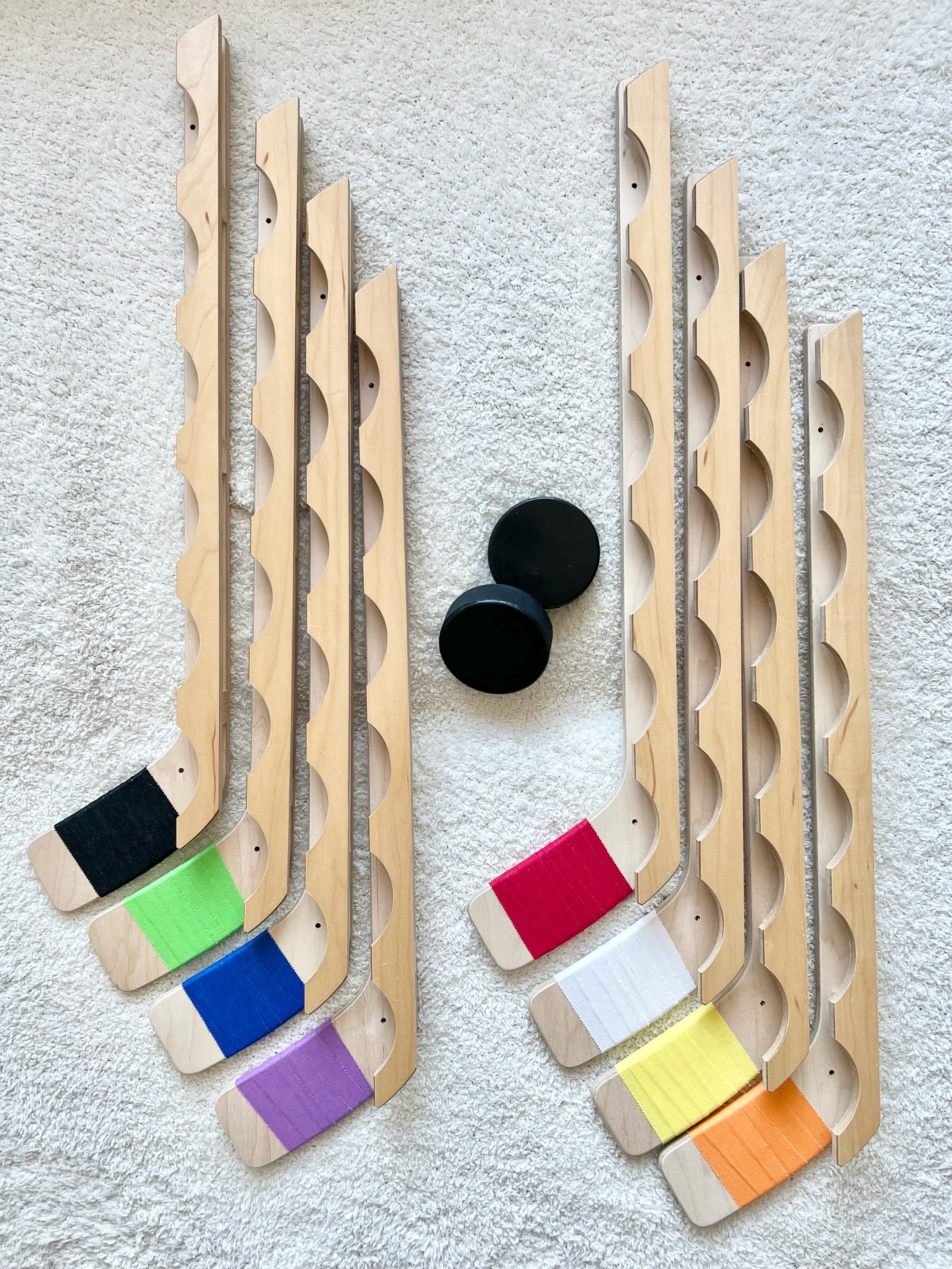 Pucks and hanging attachments are not included.