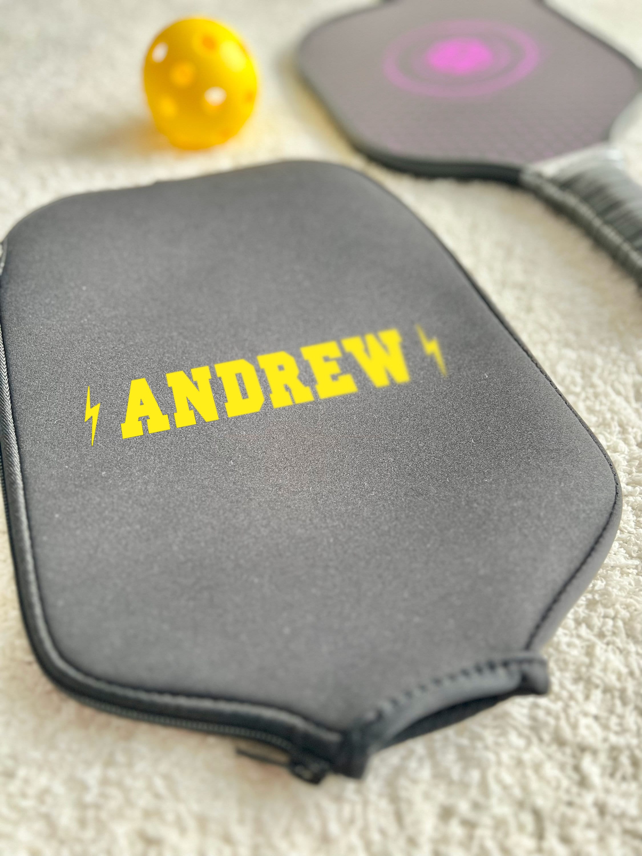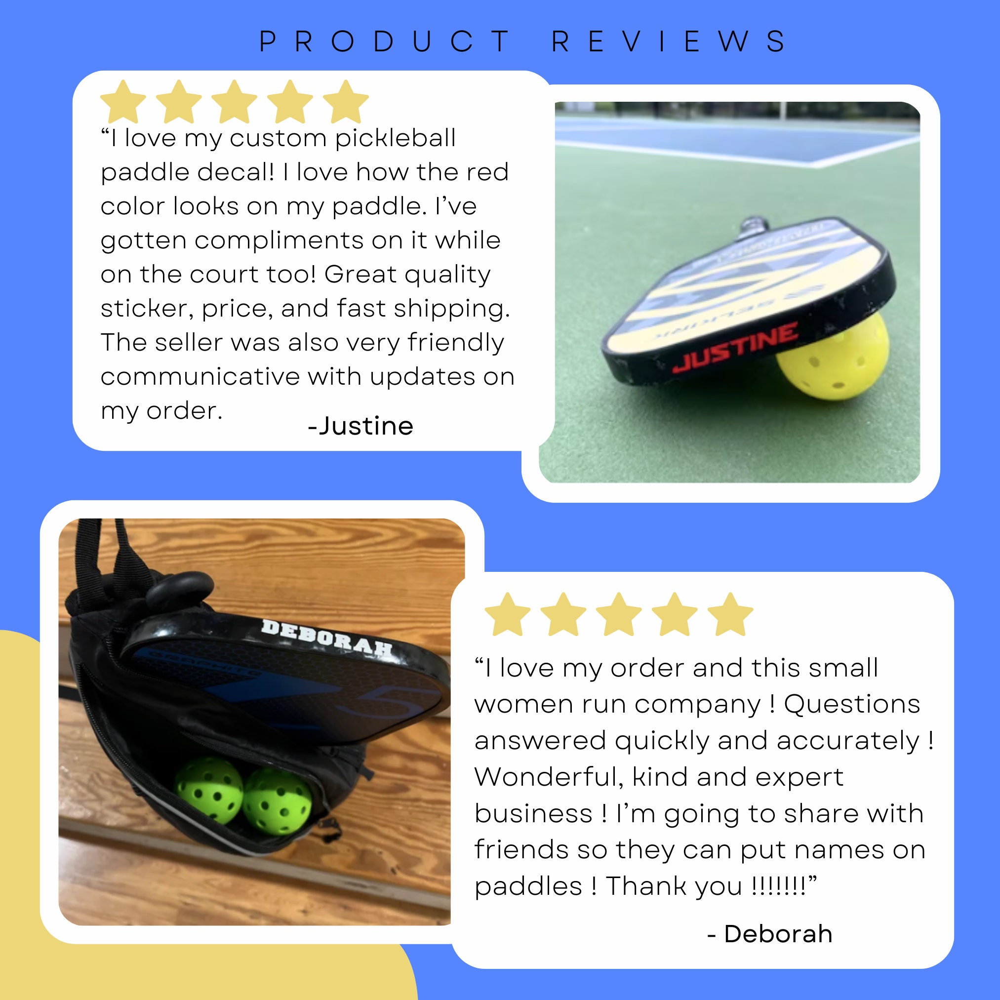 Your custom pickleball paddle edge guard decal can be personalized with your name! Choose your customized style and color options. Get a custom pickleball paddle cover to match! Have a different design in mind? Feel free to reach out so that we can help bring your design to life or check out our other pickleball related items further below.
