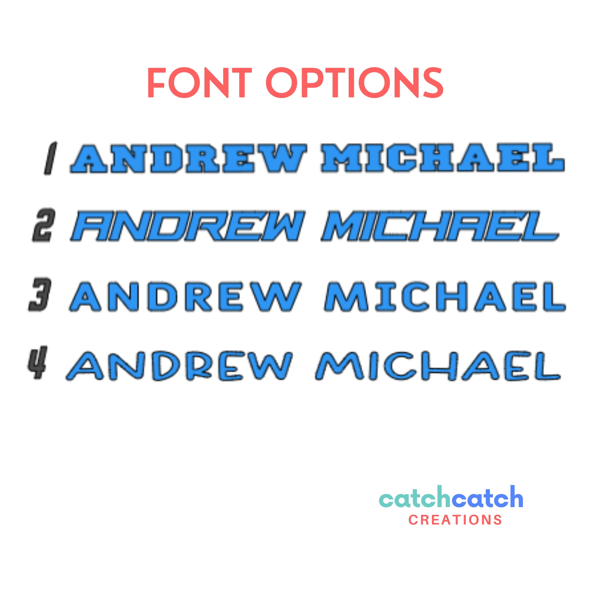 3) In the personalization box, put (1) Name (max 14 characters), (2) Font Number, (3) Graphic if needed. Please double check the spelling of the name. If no font is selected, the default will be font option #1. ๐๐ ๐ฎ๐บ๐ฝ๐น๐ฒ: ๐๐ป๐ฑ๐ฟ๐ฒ๐, ๐๐ผ๐ป๐ #๐ฎ, ๐๐ฟ๐ฎ๐ฝ๐ต๐ถ๐ฐ #๐ญ
